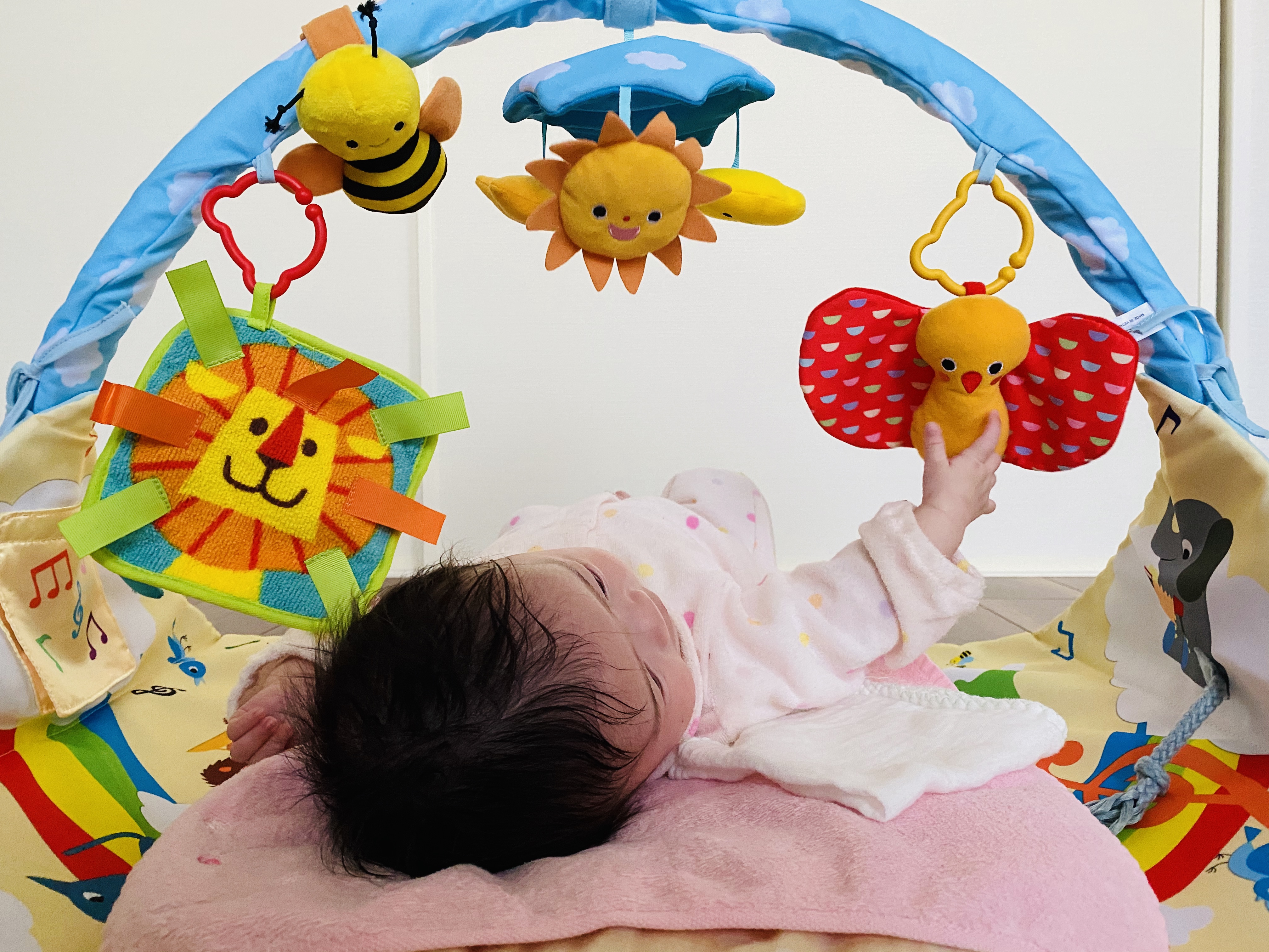 ベビージムのアーチにつるされたぬいぐるみをゆっくり揺らしてみる。中央の太陽と星とお月様をじーっと見つめる娘。徐々に興味を持ち始め、手を伸ばし始めました。