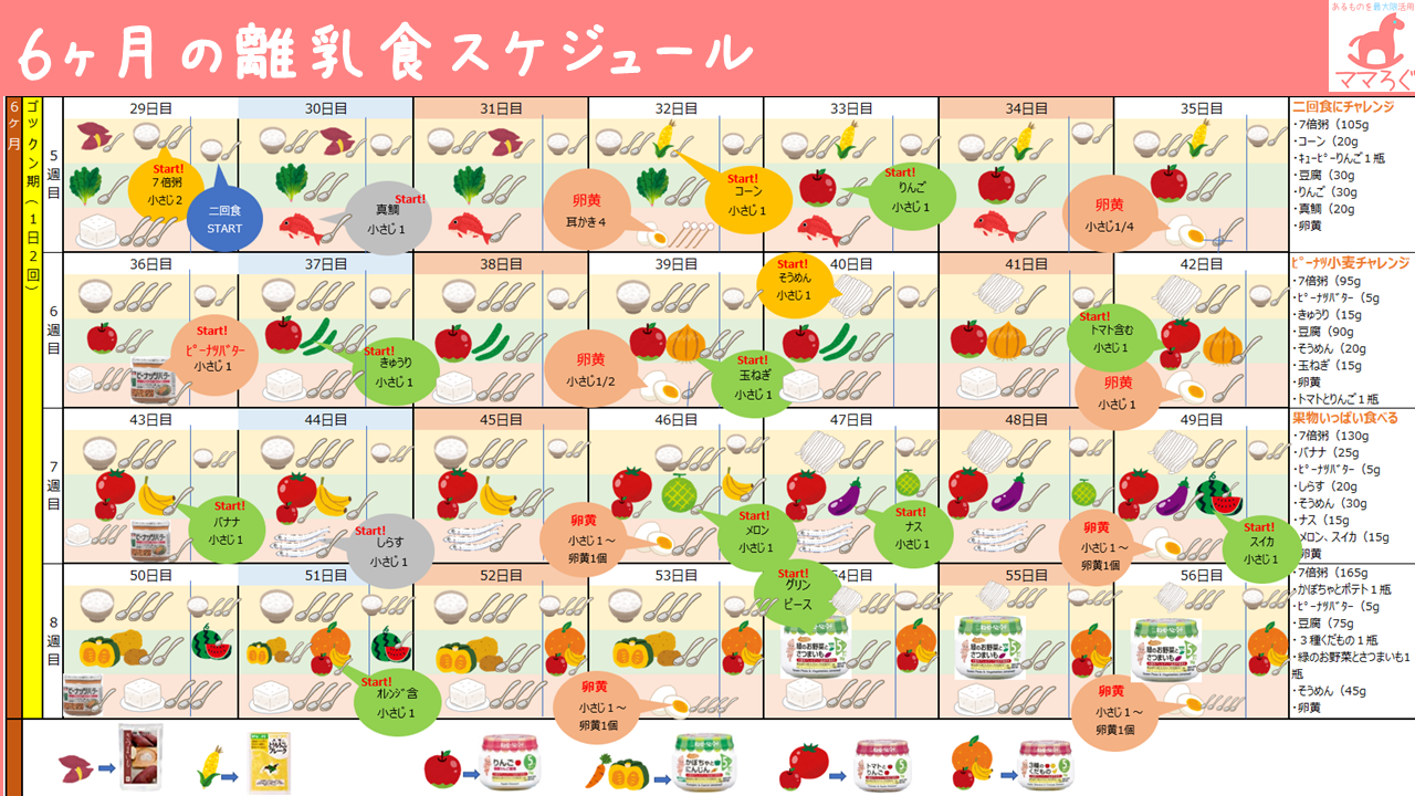 離乳食本やアプリをそのまま参考にすると手作りがメインになってしまうので、なるべく手間をかけずに済むようベビーフードを活用した「5ヶ月から卵黄、6ヶ月から二回食」に対応する離乳食スケジュールを作成して実践してみました。