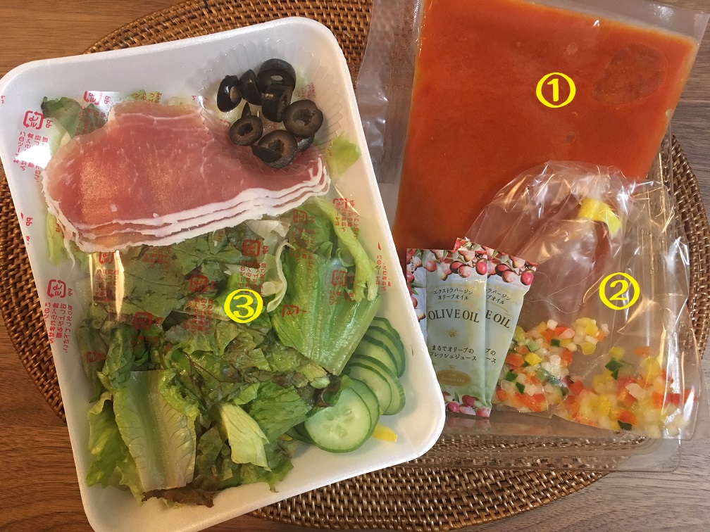 今回のガスパチョ&生ハムサラダは食材を混ぜて盛り付けるだけで簡単に2品できちゃう優れもの。冷製スープなので暑い日にぴったりですね。火を使わずに済ませられるのもミールキットのいいところです。